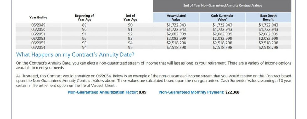 Please see the illustration example below. This was created with a $100,000 initial premium amount for a 60-year-old male.